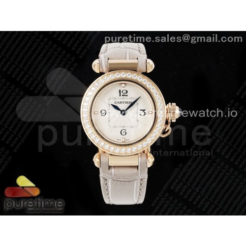 • AF공장 까르띠에 파샤 30mm 로즈골드금통 화이트다이얼 다이아몬드베젤 화이트가죽스트랩 Pasha 30mm RG AF 1:1 Best Edition White Textured Dial Diamonds Bezel on Gray Leather Strap Jaq Quartz